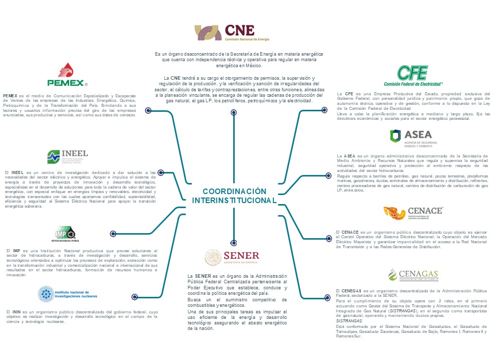 Los principales órganos reguladores son la Comisión Nacional de Energía (CNE), la Secretaría de Energía (SENER), la Comisión Nacional Antimonopolio (CNA) y la Secretaría de Hacienda y Crédito Público (SHCP).